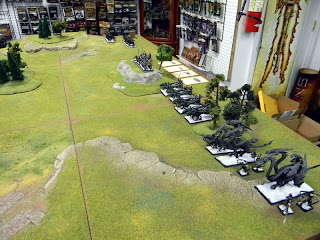 Fast cav started on his far left, Knights with BSB in the center, and his right win was the Chosen and Warriors backed up by both Warshrines. It was his way of countering my Strong Flank by making his opposing flank as strong as possible. My deployment...
